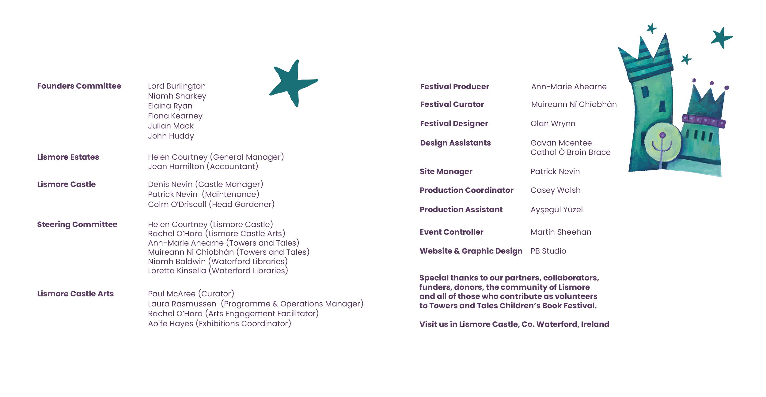 This year, the twelfth iteration of the festival, is brought to you by a new creative team, as Festival Founders and Artistic Directors Niamh Sharkey and Elaina Ryan, along with Festival Producer Aisling Fitzgerald begin new chapters. We are deeply grateful to Niamh and Elaina especially, for being the first to Knock for a Story on the Castle doors over a decade ago and for their dedication to filling the towers with tales year after year.
